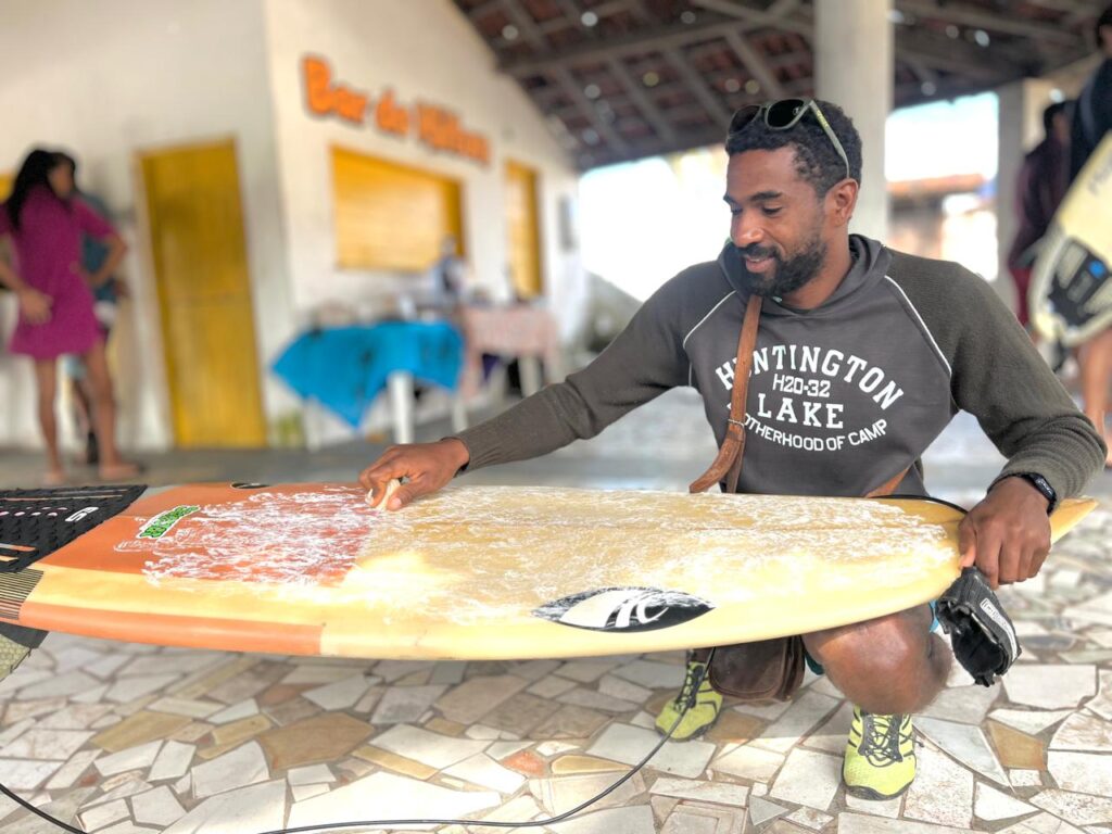 Afonso passando parafina na prancha – Foto: Gilsimara Cardoso