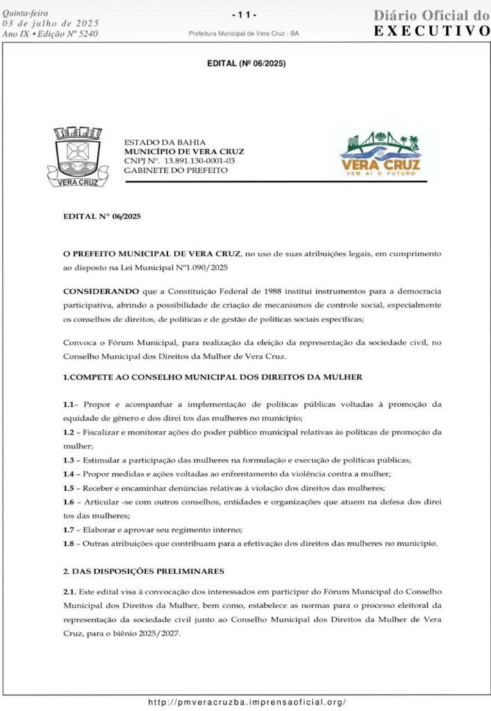 A Secretaria de Assistência Social de Vera Cruz informou que a posse oficial do Conselho Municipal dos Direitos da Mulher ocorreu em conformidade com o Edital nº 06/2025. O órgão, de caráter paritário, reúne representantes do poder público e da sociedade civil, com a missão de formular, fiscalizar e acompanhar políticas públicas voltadas às mulheres. Segundo a secretária Eneida Souza, o processo ocorreu por meio de eleição, o prefeito indicou cinco representantes do poder público e, entre as entidades da sociedade civil, cinco se inscreveram e foram eleitas. A nova composição, segundo a secretária, reafirma o compromisso do município com a equidade de gênero, o enfrentamento à violência contra a mulher e o fortalecimento da cidadania feminina.