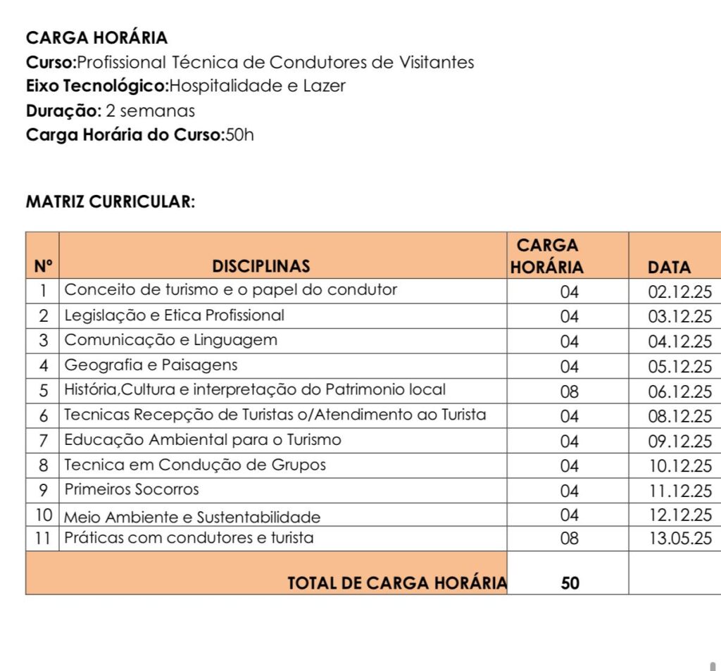 Com uma carga horária de 50 horas, o curso movimentou o município durante a primeira quinzena de dezembro. Desde o início, as aulas abordaram temas essenciais para a atuação profissional. Entre eles, estiveram o conceito de turismo, o papel do condutor e a legislação da área.