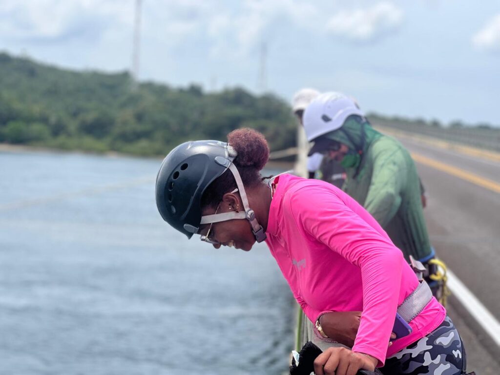 A presença feminina também se destaca no rapel da Ponte do Funil, reafirmando que coragem e protagonismo não têm gênero. Entre as mulheres que desafiaram a altura e o medo, Letícia Correia se destaca pela experiência e pelo entusiasmo. “Já fiz várias vezes e vale a pena. Vale a pena porque é viciante. Quem nunca fez, venha, porque depois não para nunca mais”, afirma.