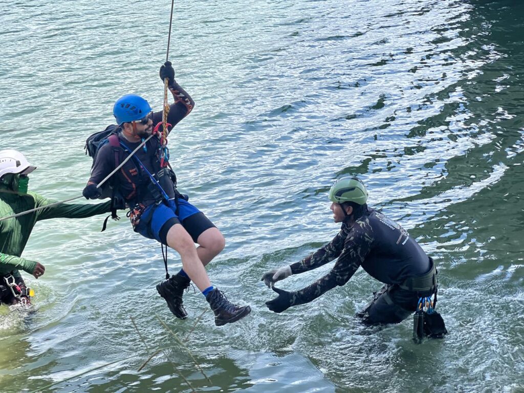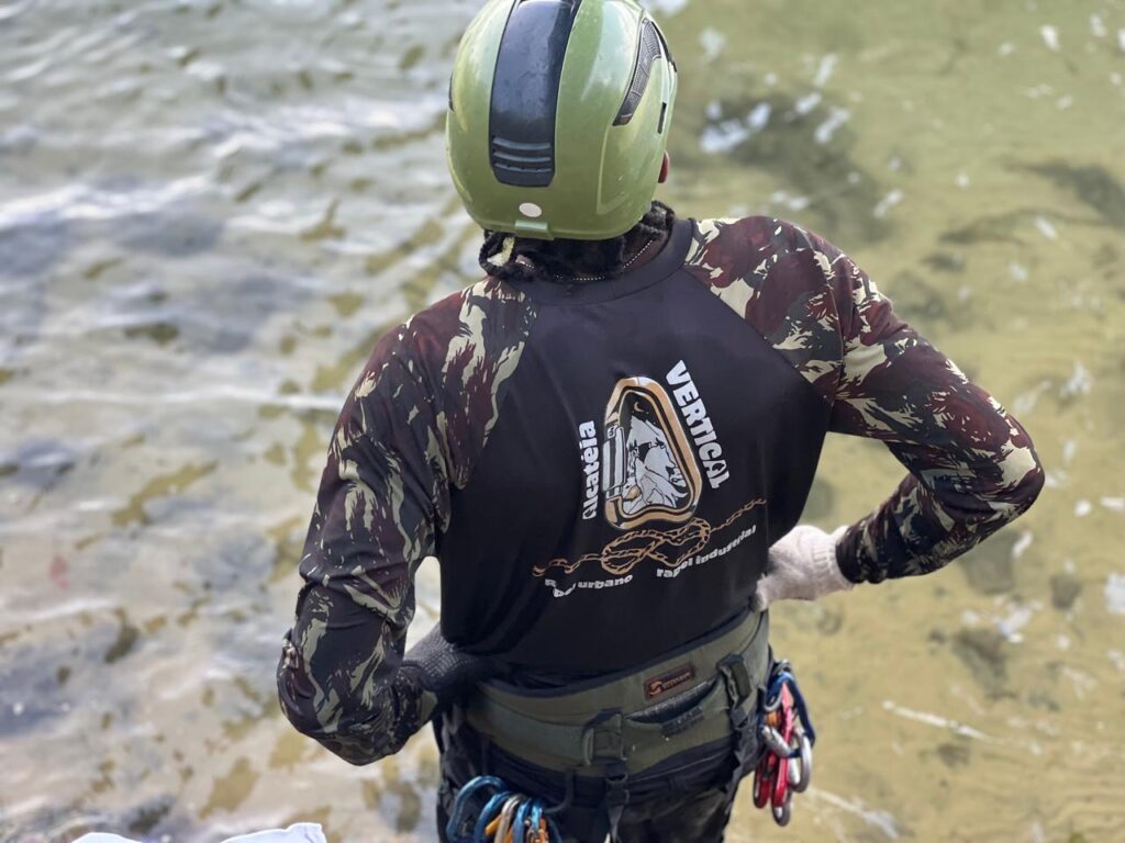 Contudo, Luiz Afonso, instrutor da Alcateia Vertical, rompe o silêncio em tom firme e tranquilo: “Solte o corpo, está seguro. Solte a corda.”