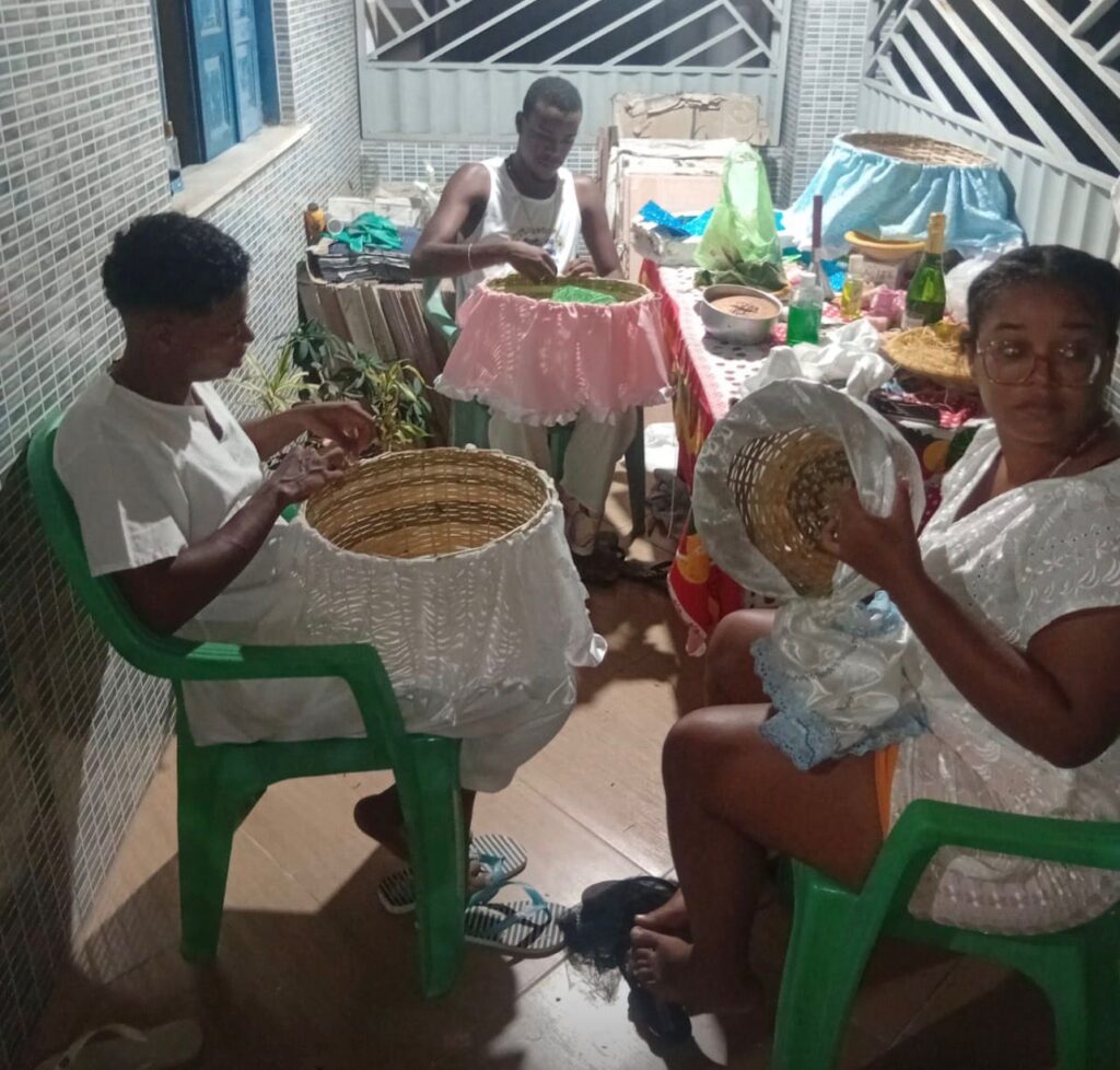 “O desânimo tomou conta, não estava com muita disposição para organizar a festa. Meus irmãos me cobraram porque já estava em cima da hora, faltava pouco tempo para a data da festa. Como já tínhamos um grupo de WhatsApp, pediram para que eu colocasse no grupo tudo o que seria preciso para a realização do evento. Digitei tudo direitinho. Um escolheu o balaio, outro escolheu a talha e assim sucessivamente até completar os itens necessários. Daí eu senti aquele empurrão. Os grãos, que são preparados nas comidas votivas, sempre ficam por minha conta. Comprei.”