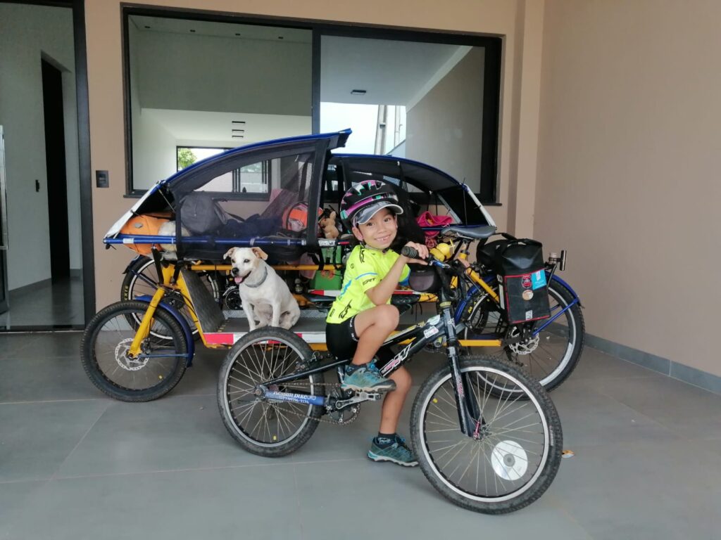 A família Romero, a Lígia, Edinei e sua filha Isabel, de 8 anos, decidiu pedalar conosco.